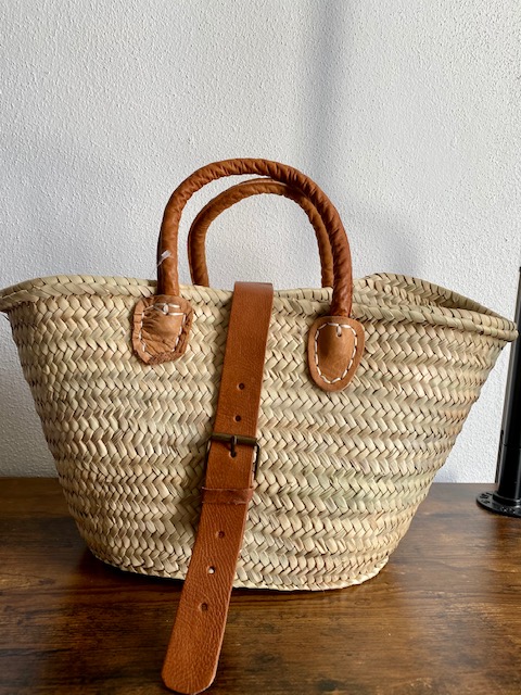 Korb aus Palmenblättern mit kurzem Ledergriff  und Lederriemenverschluss