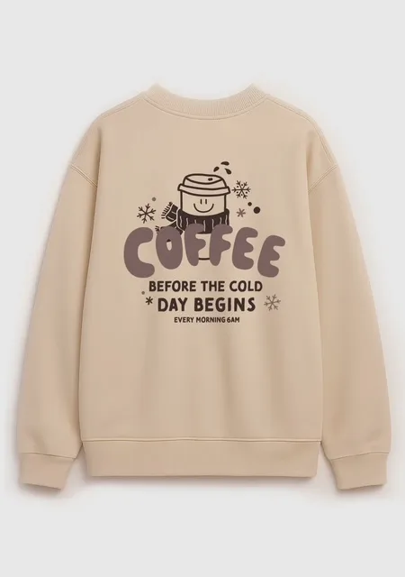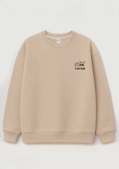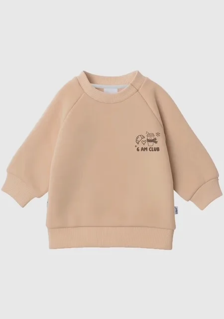 Unser beige Coffee-Sweatshirt kommt im Oversized Fit mit „6am“ Print vorn und dem Statement „Coffee before the Chaos unfolds“ auf dem Rücken.