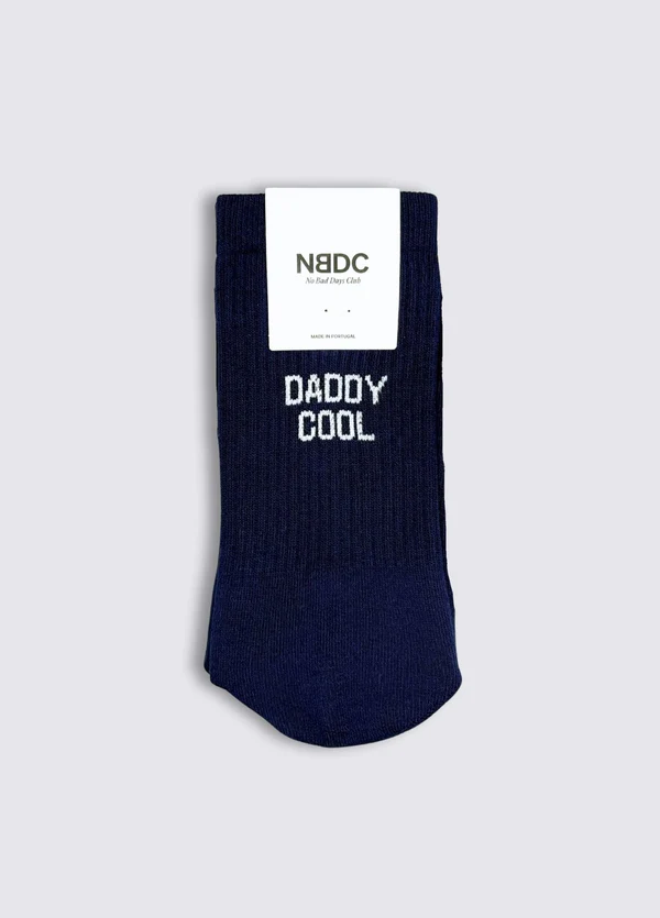 Ein Klassiker mit Augenzwinkern. DADDY COOL feiert den Status mit Stil – selbstironisch, entspannt, charmant. Weiße Message auf dunkelblauem Socken.