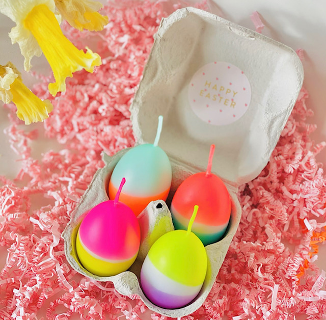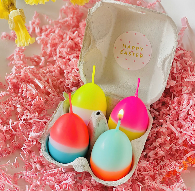 • vier liebevoll handgefärbte Eierkerzen im Neonlook, verpackt in einem Eierkarton mit handgedruckter Siebdruckbanderole