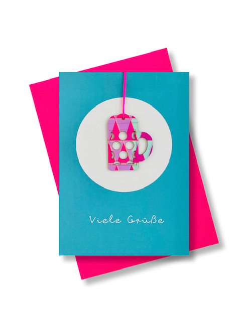 • Siebdruck Klappkarte C6 mit einem handgedrucktem Anhänger aus Birkensperrholz zum Ablösen