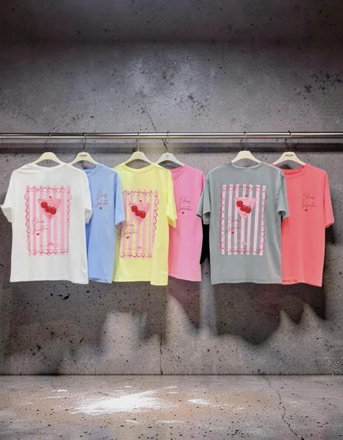 Das liebevoll gestaltete Kirschmotiv verleiht dem Shirt eine fruchtige, lebendige Note und setzt einen charmanten Akzent, der sofort ins Auge fällt. Der moderne Schnitt bietet eine bequeme Passform, die sowohl lässig als auch stilvoll wirkt und sich vielseitig kombinieren lässt – ob mit Jeans, Shorts oder Rock.