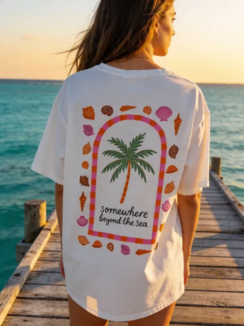 Das liebevoll gestaltete Palmenmotiv verleiht dem Shirt eine lebendige Note und setzt einen charmanten Akzent, der sofort ins Auge fällt. Der moderne Schnitt bietet eine bequeme Passform, die sowohl lässig als auch stilvoll wirkt und sich vielseitig kombinieren lässt – ob mit Jeans, Shorts oder Rock.